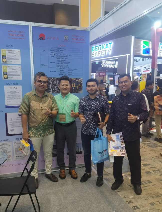 br>At the exhibition, the responsible comrade in charge of Shandong Molong actively attended the relevant leaders of Indonesia National Petroleum Company, and provided a detailed introduction to the company's main products such as oil pipes, oil casings, oil pumps, and oil rods. They also systematically elaborated on the company's industrial layout and market expansion. During this period, we had in-depth exchanges with petroleum equipment companies and manufacturers in the same industry regarding the market and drilling technology, and gained a detailed understanding of professional knowledge in oil and gas exploration, production, transportation, storage, and other aspects. At the same time, through self promotion, more customers have gained a better understanding of the company's production status and product content, thereby enhancing the company's international reputation.