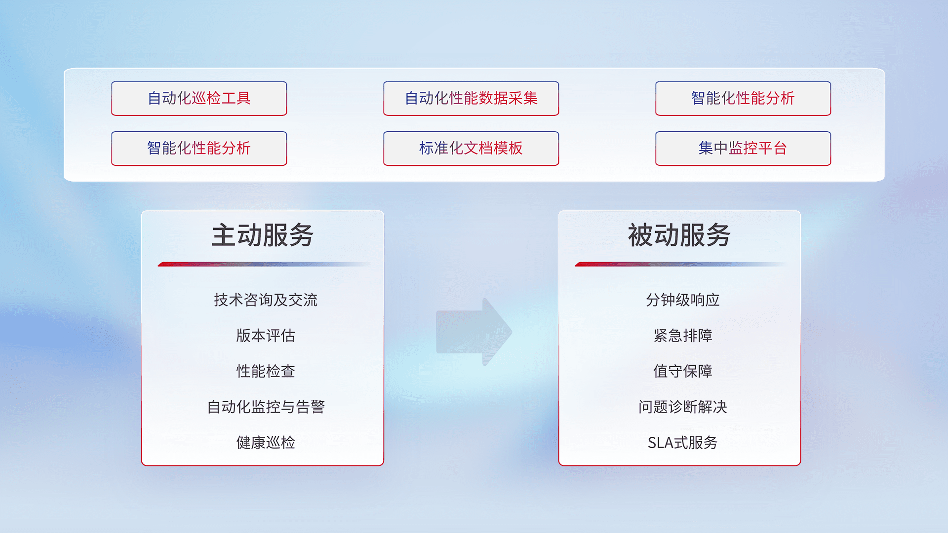 智能化工具和标准化文档,,,保障服务质量,,提供主动服务(包含技术咨询、、版本评估、、、性能检查、、、自动化监控与告警、、、健康巡检)和被动服务包含(分钟级响应、、、、紧急排障、、、值守保障、、、、问题诊断解决、、、、SLA服务)。。。